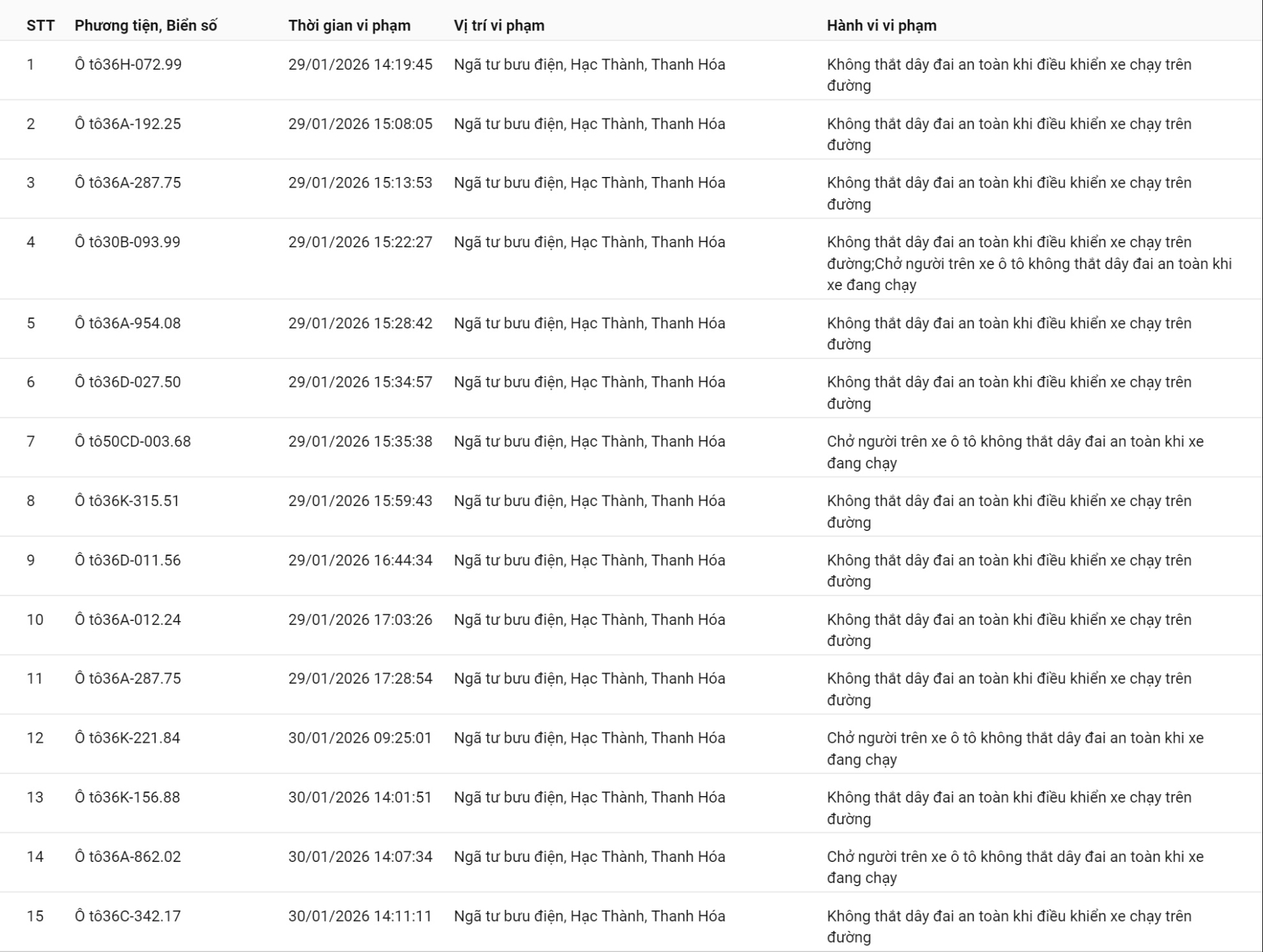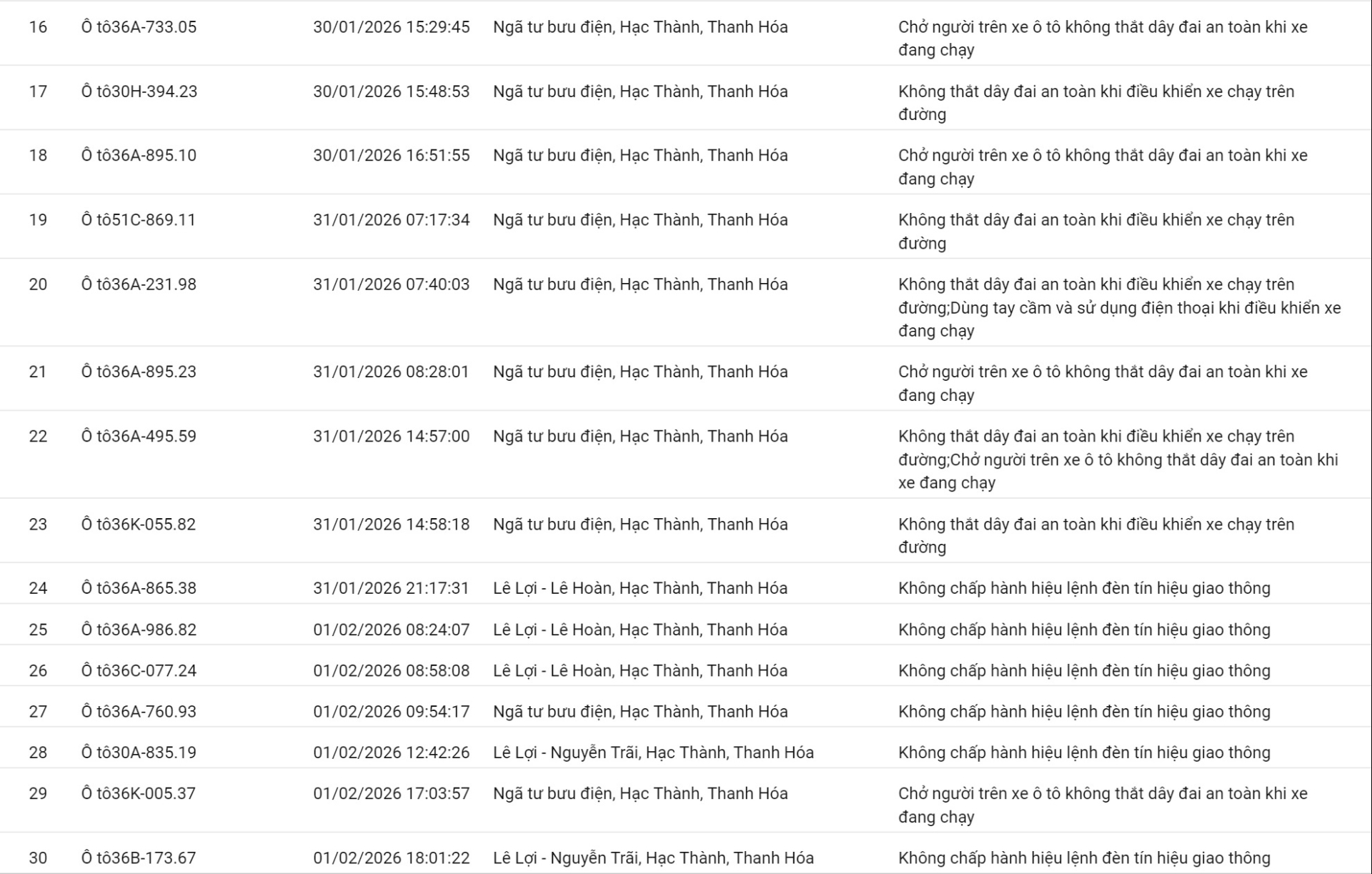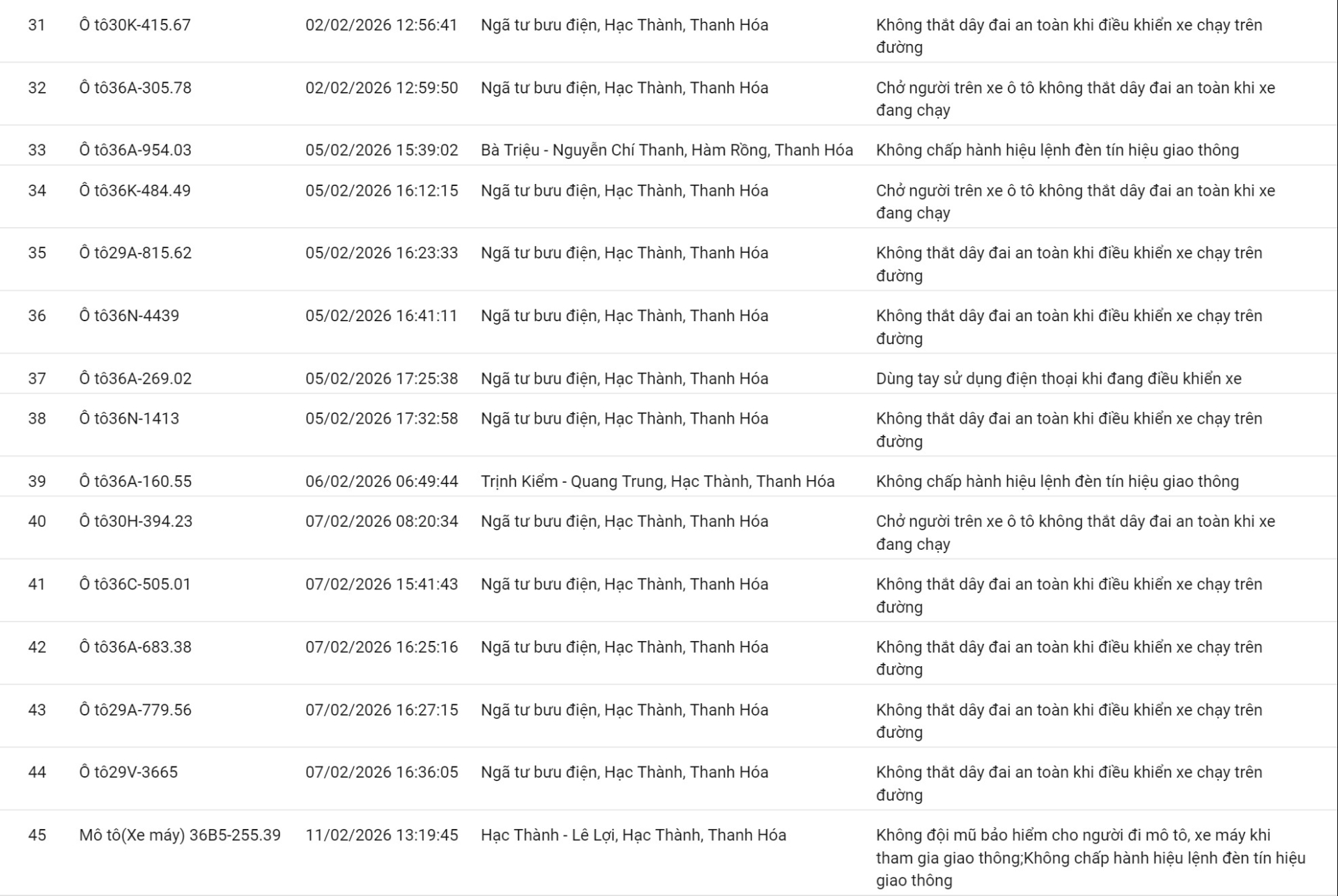 Phòng CSGT tỉnh Thanh Hóa đã xác định thêm nhiều trường hợp vi phạm bị phạt nguội từ ngày 29/01/2026 đến ngày 12/02/2026.