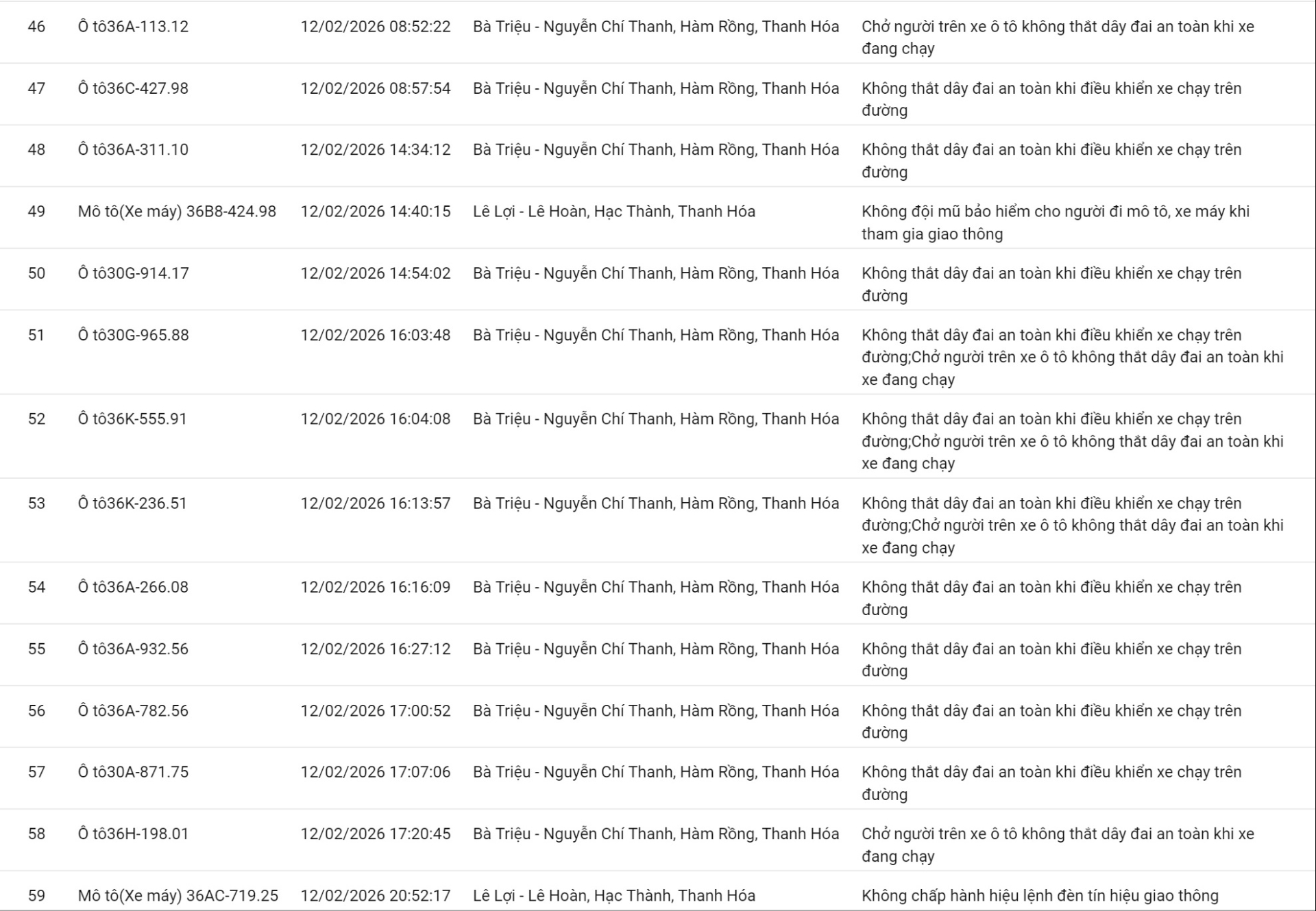 Công an tỉnh Thanh Hóa thông báo, từ ngày 29/01/2026 đến ngày 12/02/2026, thông qua thiết bị kỹ thuật nghiệp vụ, các tổ công tác của phòng CSGT đã phát hiện, ghi nhận bằng hình ảnh tổng cộng 59 trường hợp phương tiện không chấp hành đúng các quy định về TTATGT đường bộ. Danh sách biển số vi phạm cụ thể như sau: